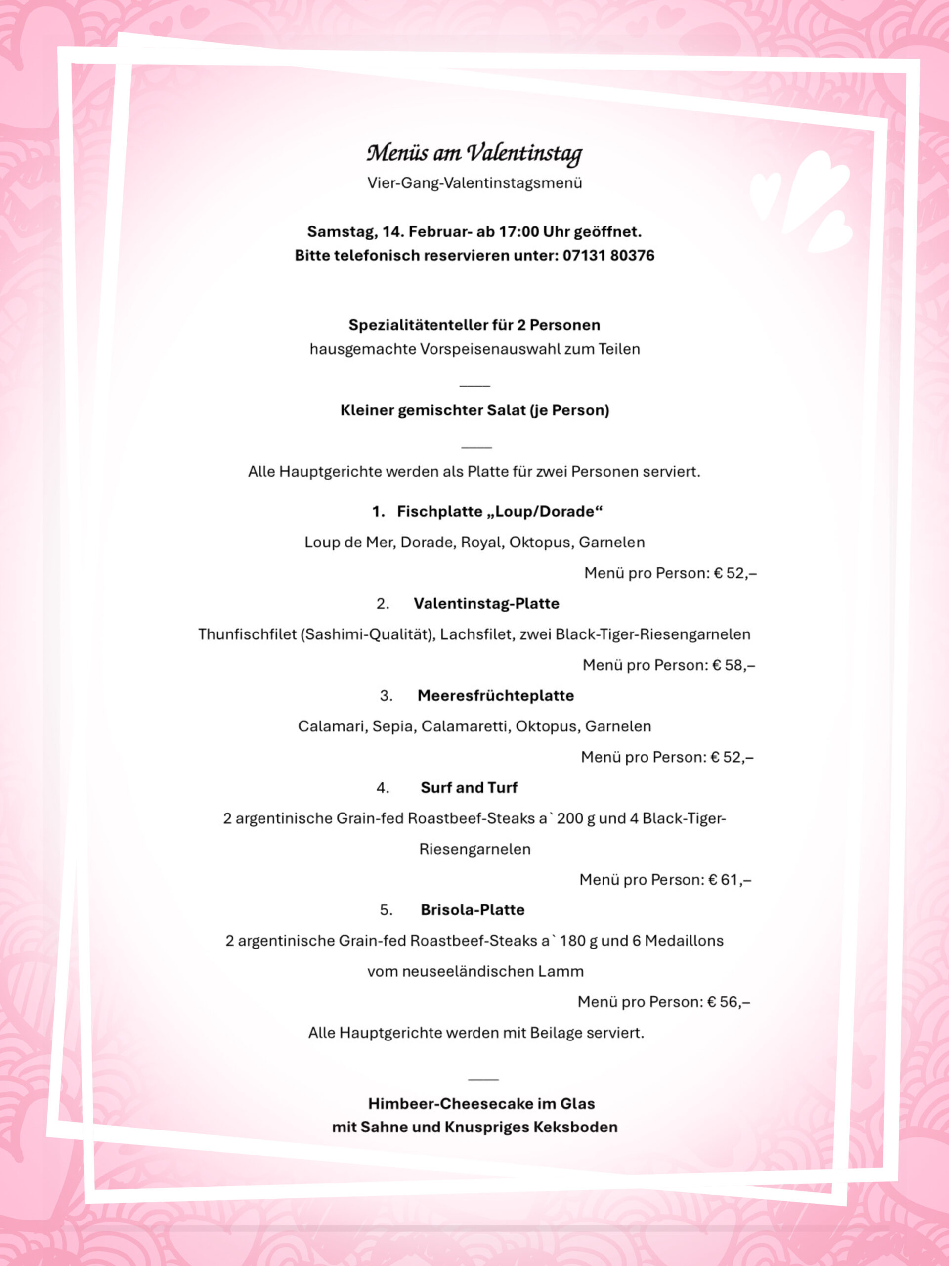 Zu unseren Fisch- und Fleischgerichten servieren wir Beilage und gemischtem Salat. Anstatt gemischtem Salat, servieren wir Ihnen gerne einen griechischen Bauernsalat und berechnen hierbei einen Aufpreis von 4,00 €